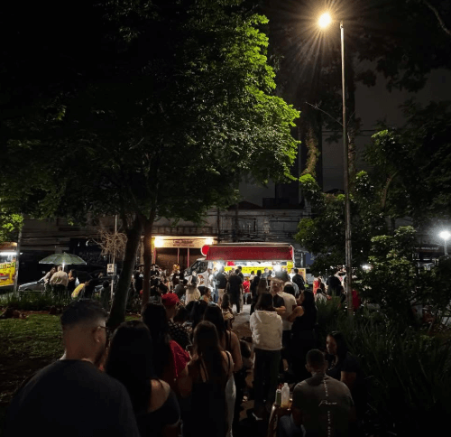 Mais do que um espaço para comer, a Praça Sílvio Romero se tornou um ponto de convivência e socialização. As imagens mostram grupos de amigos reunidos nas mesas ao ar livre, famílias compartilhando lanches e casais aproveitando o clima noturno sob as luzes dos postes e árvores. O contraste entre o passado tradicional da praça e a modernidade dos food trucks cria um cenário urbano encantador, onde o lazer e a gastronomia se unem de forma natural.