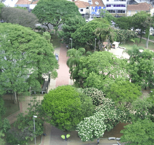 Os canteiros floridos, que mudam de cor conforme as estações, acrescentam vida e movimento ao ambiente, enquanto os bancos de concreto espalhados pela praça se tornam pontos de descanso e convivência. As imagens destacam o cotidiano simples, mas cheio de significado: pessoas lendo sob as árvores, idosos conversando, crianças brincando e jovens aproveitando o clima leve do lugar.